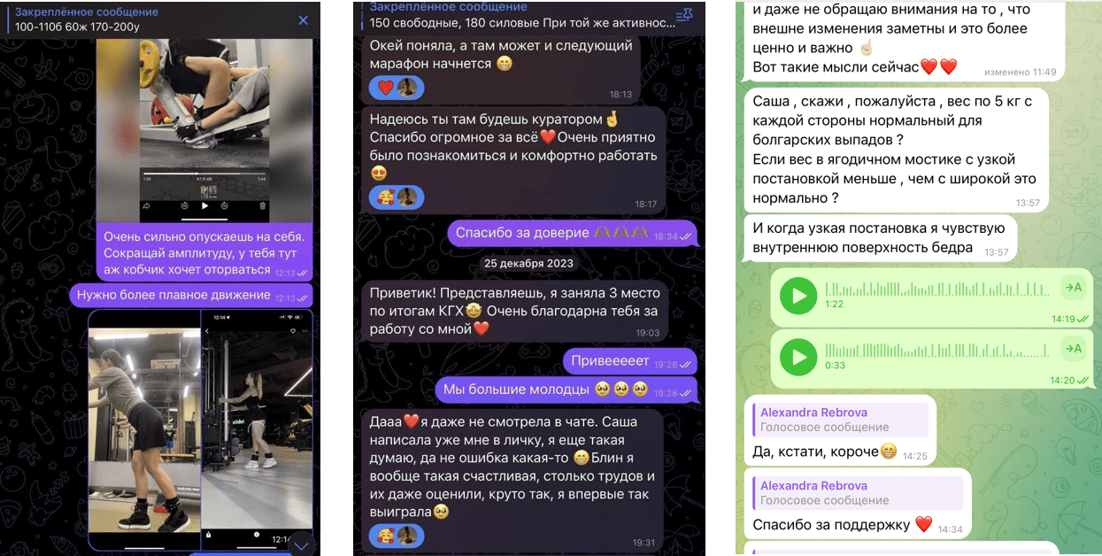 Общение с куратором в личном чате 1 на 1, где куратор индивидуализирует программу под Вас, проверяет отчёты по питанию и тренировкам, а также отвечает на все вопросы